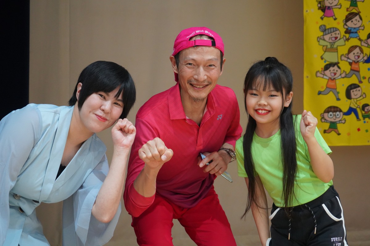途中では「OKウォークtips」としてショートウォーキングレクチャーも実施。そして毎年恒例となった「ハギュットマン体操<スーパーハード編♪>」では、優花さん、おりんちゃんをはじめ、会場のkidsたちと一緒に全力で踊りました。こどもたちの笑顔とエネルギーに、こちらが元気をもらう瞬間です。
