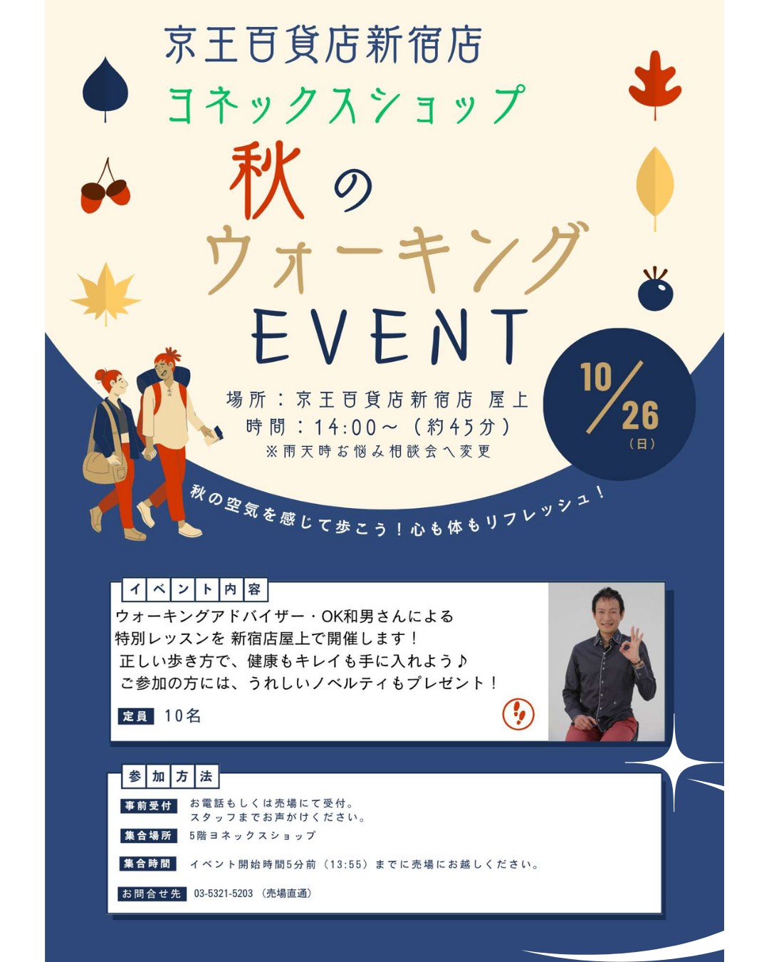 10月26日 東京 京王百貨店 新宿店・屋上にて、※雨天時は5階靴売場内にスペースにて個別レクチャー付きの特別メニューに変更!(雨天決行)/13:55 お客様5階ヨネックスショップへ集合、その後屋上のイベントスペースまで全員一緒に移動します。嬉しいお土産付き♪